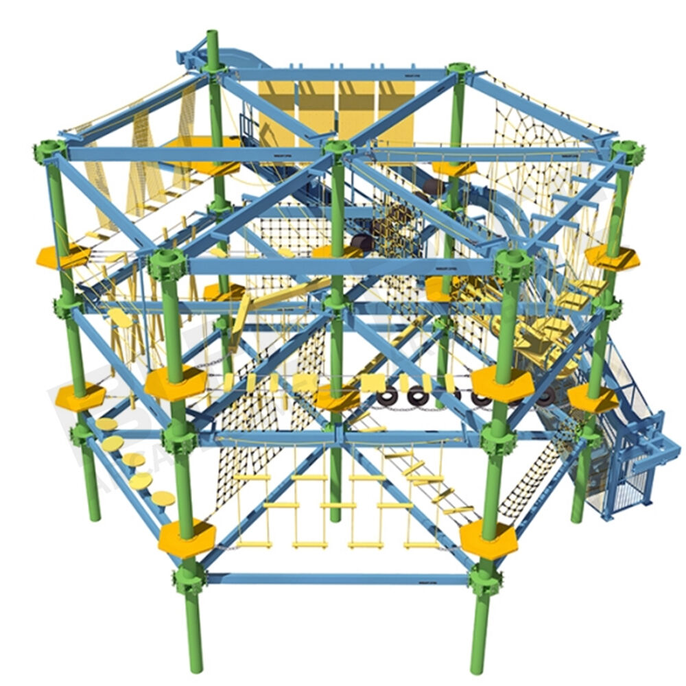 Exploration Tower Design: The Exploration Tower uses a unique structure, with obstacles of varying difficulty and style set up between steel or wood columns. This design makes the tower stable and ensures the space is used well. There's also a viewing platform that can be 80-200 square meters, perfect for dining, lounge areas, coffee bars, or pubs. The platforms can hold 30-80 people each, thanks to the support rods underneath.